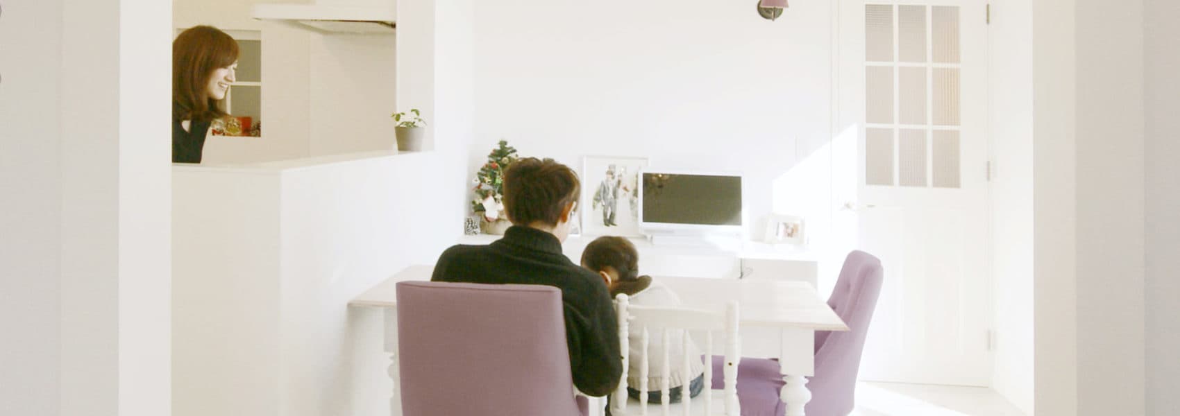 と、笑顔のM様ご夫妻。奥様が取り寄せた一冊の洋書からスタートした家創りは「窓もテーブルも照明も、この家の中のすべてのものがお気に入り」という、隅々までご夫妻の「好き」で満たされたフレンチホワイトの素敵なお家です。住んで間もないのに、家族を慈しむような温かさが漂うのはすべてがお気に入りのものだけに囲まれた暮らしだからでしょうか…。