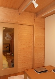 壁の一面を、杉板貼りにし、
