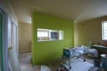 センターキッチンの壁をアクセントにし、さわやかな色の グリーン を選択。