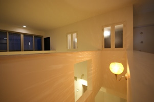 風通しと開放感をはなてるよう、吹き抜けの上にある寝室に、室内窓をもうけました。