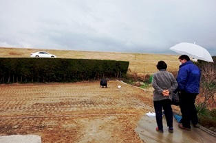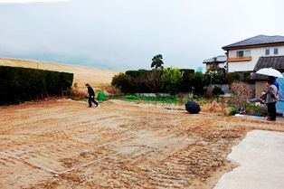 雨の中、施主様立ち合いのもと地縄を張りました。