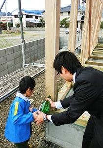 2014/3/7上棟 T邸 鳴門市大麻町★工事の進捗状況★ T様 鳴門市大麻町お引渡し ⇔ 内装 ⇔ 外観 ⇔外壁 → 断熱材工事 → 窓枠 → 上棟後 → 上棟 →建て方 → 基礎配筋 → 砕石・防蟻処理・捨コン → 掘り方 → 遣り方 → 地鎮祭 鳴門市 T様 の上棟式 お父様と息子さん 2人で一緒に 御神酒をかけました おめでとうございます★サーロジックのホームページヘ ★ 今、ご覧いただいているのはサーロジックの ブログのページ です