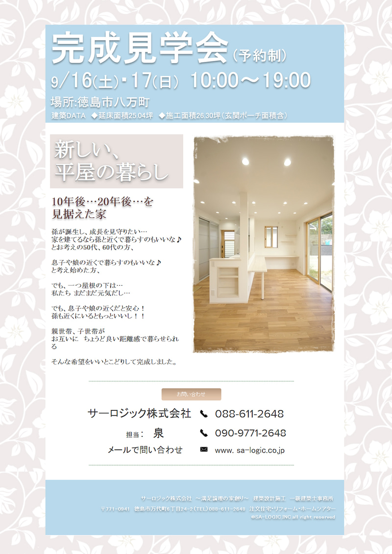 2017/9/1650代、60代の平屋 見学ご希望の方は 下記のいずれかよりご予約、お願いいたします。 ********************************************** ① 088-611-2648 AM10:00- (水)定休② 090-9771-8613 (担当者直通:泉)③ メールで予約 ******************************************* 当日は、現地でしかご案内できないサプライズをご用意しております♪ Sy様邸 ブログはコチラ↓↓からご覧いただけます♪ 引渡し →見学会案内 NEO →平屋 →見学会 → 断熱材 →瓦・防水シート →上棟後 現場 →上棟 →建て方 →土台 →基礎 →型枠 →打設 →配筋 捨てコン →土壌処理 →砕石 →掘り方 →遣り方 →地鎮祭