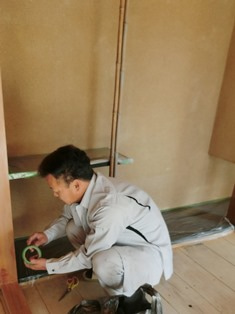 床の間に養生をする左官屋さん↑