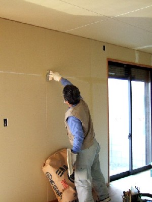 2006/1/28S邸(徳島市川内町) ~クロス下地~クロスを貼る前に下地調整をしているところです。クロスの下地となるのは、石膏ボードや合板でそれらの継ぎ目や 段差・隙間等が平滑に仕上げるために、パテ仕上をします。 下地パテ・仕上パテ、また状態によりパテの回数を変えて仕上ます。 ~目に付かない下地作りを丁寧にすることが、 最終的にきれいな仕上がりにつながります。~