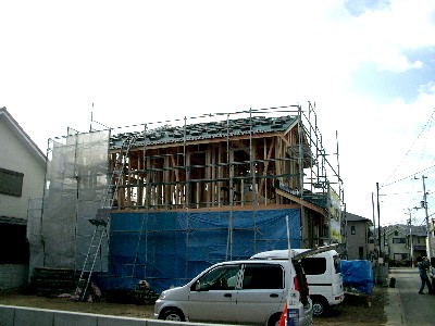2006/2/8S邸(徳島市大谷町) ~ブルーシート~写真左の白いシートをしていても、強風になると外壁を貼るまでの間は、大工工事で出た木屑がご近所に飛んでいってしまうこともあります。そこでブルーシートで囲むことにしました。ご近所の方申しわけございません。建築中は何かとご迷惑をおかけすると思いますが、ご協力のほど宜しくお願いいたします。