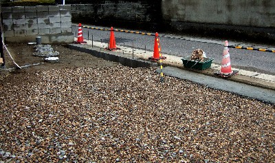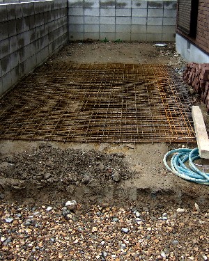 2006/2/20S邸(徳島市川内町) ~外構~お天気をみながら、外構工事にかかります。 手前、茶色の石は土間コンクリートをする部分です。 その上に、車がのっても大丈夫なように ワイヤメッシュ↓を敷きます。その後、コンクリートを流し込むことになります。コンクリートを流し込むのは、先にブロック塀やポストを設置するので、もう少し先になります。