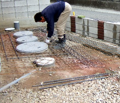 2006/2/23S邸(徳島市川内町) ~外構ブロック積~ ブロックを積んでいるところ。穴をあけたり、カットしたり細かな作業です。 コンクリートを流す前にワイヤメッシュ筋を敷いています。浄化槽のまわりを調整中です。