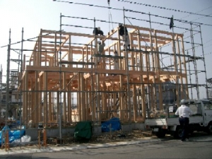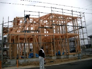 1階梁を組み建て中。