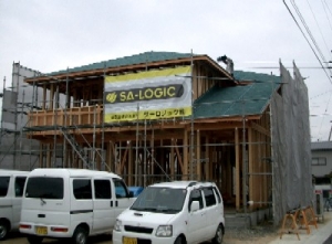 2006/3/16F邸(羽ノ浦町) ~屋根ルーフィング~屋根にある緑色は、屋根下地のルーフィングです。F邸は屋根が壁に当たる部分があるので、そこ(サーロジックのシート右端、屋根が手前におりてきている部分)は20cm以上ルーフィングを壁に沿って立ち上げ、水の進入を防ぎます。 ルーフィング 屋根瓦の下に入り込んだ水を建物内部に入らない様、外に流す役目をします。