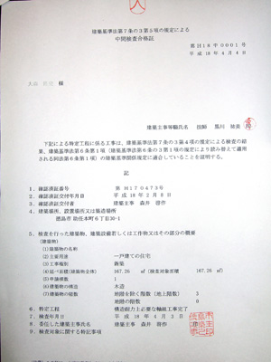 2006/4/17O邸 (徳島市下助任本町) ~中間検査~財)住宅保証機構とは別に、建築基準法に基づき 木造建築物で地階を除く階数が3以上のものに該当するため 中間検査もうけます。建築課へ納める申請手数料は15.000円です。