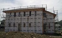 外壁の下地、防水透湿シートを貼っています。