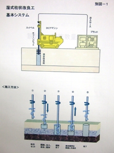 地耐力調査の結果より、不同沈下を防止するため、柱状改良工法で基礎の補強を行います。左図は湿式柱状改良工事の基本システムと施工方法です。