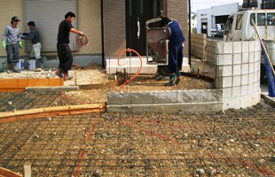 駐車場になる部分です。コンクリート仕上げですが、車がのっても大丈夫なように、ワイヤメッシュを敷いています。