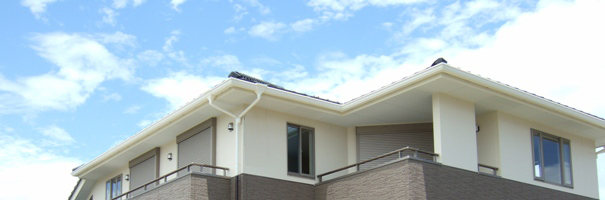 2006/7/16H邸 (鳴門市高島)引き続き・・・空の色がきれいなのでついつい上部メインで。 (合成じゃありません。念のため。)実は、土地の場所柄、見晴らしがよくて、空がすごくきれいなので、軒天や破風、樋の色も空に溶け込んだら素敵かな・・・と思い、当初は違う色で決定しておりましたが、最後の最後で変更しました。