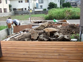 ウッドデッキ前に岩が山盛り・・