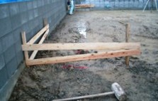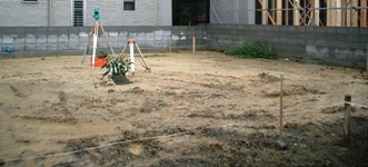 2006/9/19N邸 (徳島市北島田町) ~地縄張り:水盛り遣り方~↑地縄張り 家が建つところに縄を張って、設計図どおりに建物の配置を決めていく作業です。↑水盛り遣り方 水盛り遣り方は、建物の位置や水平を決める作業です。 地縄を基準にして敷地に杭(水杭ともいわれます)を打ちます。 杭に、レベルを使って水平の印をつけ、基礎工事の準備をしていきます。