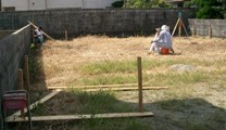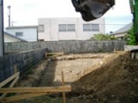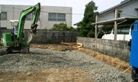 2006/10/10A邸 (阿南市那賀川町) ~地業工事~ 遣り方 建築物の正確な肯定や位置、柱や壁の中心線などを現場に明示する仮設物。 根切り 建築物の基礎や地下部分を造るために掘削すること。 地業工事 砕石を敷き、転圧して締め固めます。