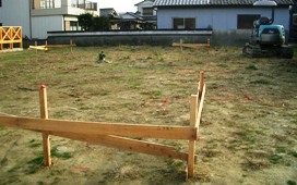 基礎工事の掘削を始める前に柱や壁の中心を決める遣り方[やりかた]を設け、高さの基準となる水平線を表示する水盛り[みずもり]を行います。