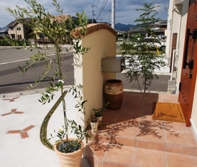 オリーブの木とやさしい外装色の雰囲気が素敵です~。西日による影もいい感じでテラコッタタイルに表情を落としてくれていますね。