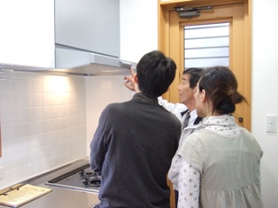 設備(写真はキッチン)の取り扱い説明をさせていただいているところです。