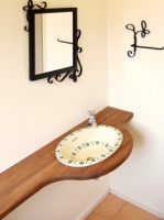 洗面ボウル、水栓、鏡、タオル掛けはお施主様がネットで見つけてこられたお気に入りのアクセサリー群です。