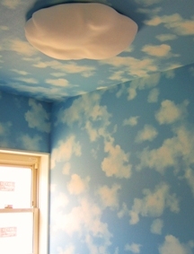 ウォークインクローゼットの天井・壁に空のクロスを貼りファンタジックに演出。雲の形をした照明器具がナイスマッチング。
