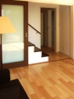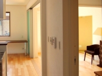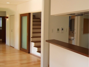 プランニングポイントその1でご紹介した玄関そで壁です。完成写真になります。玄関との広がりを保つ為、壁を天井までのばさず途中で止めています。玄関奥の隣の部屋は、子供用サブ玄関兼外部収納になります。