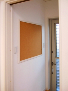 キッチンの裏側にコルクボードを設置し、その前に引き戸を設けて隠したい時は引き戸をサッと閉めればスッキリです。