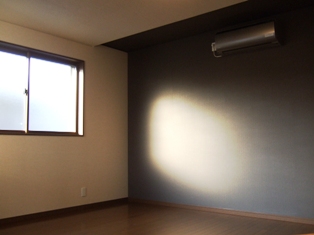 お手持ちの家具を壁一面に並べ、家具の色に合わせてクロスを貼り分けした事例です。また、天井を折りあげている所にロールスクリーンを設置し、ロールスクリーンを下ろせば家具を隠すこともできるよう計画しています。