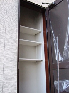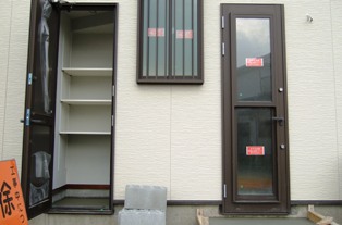 2008/4/4Y邸 (板野郡藍住町) ~外部収納~玄関横に外まわりの掃除用品やベビーカーを収納できる 外部収納があります。 勝手口横に灯油缶、物干し用具などを収納できる外部収納。 用途に合わせて外部収納を玄関横と勝手口横、2箇所に計画いたしました。