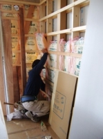 間仕切り壁に吸音効果のあるグラスウールを充填施工いたしました。