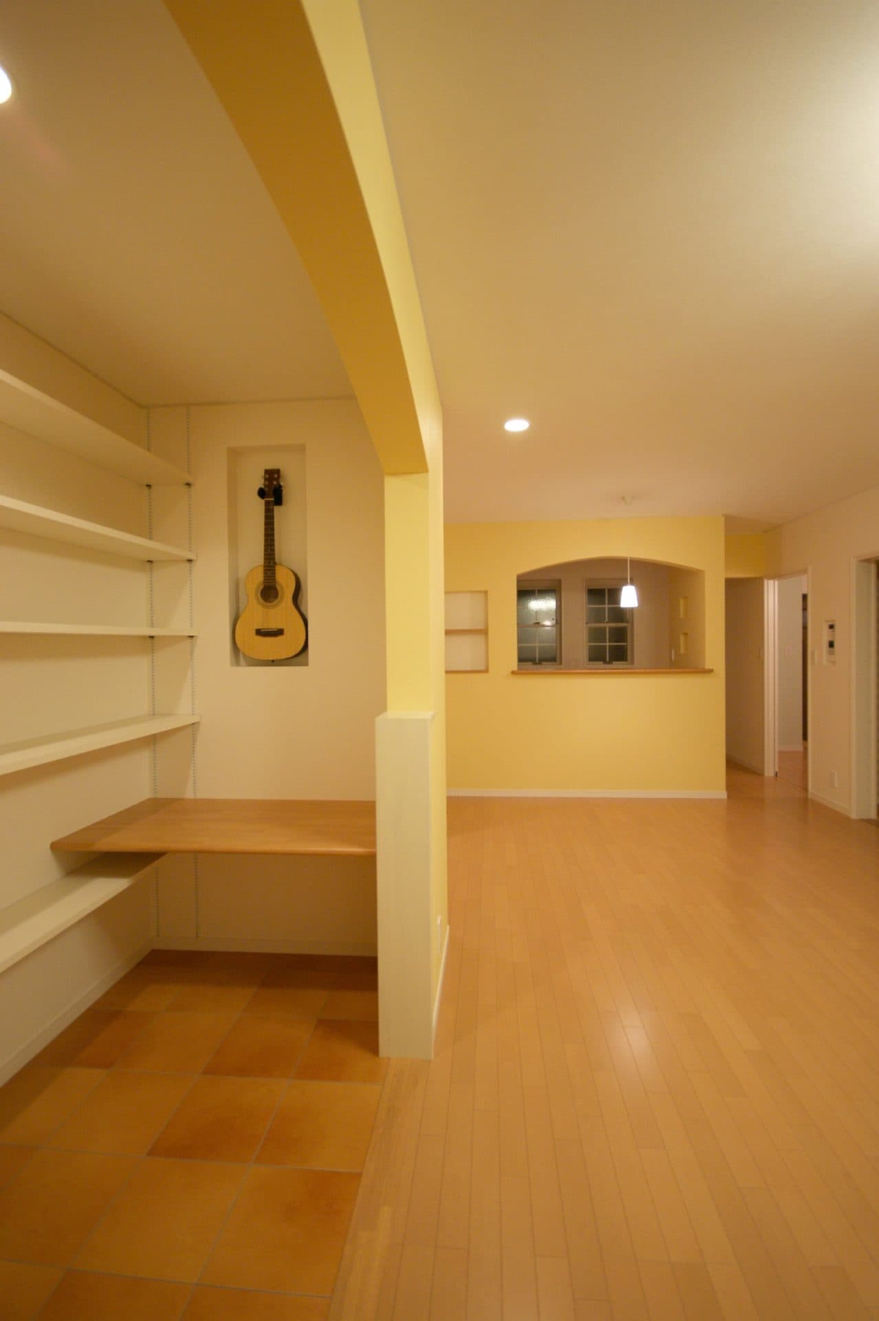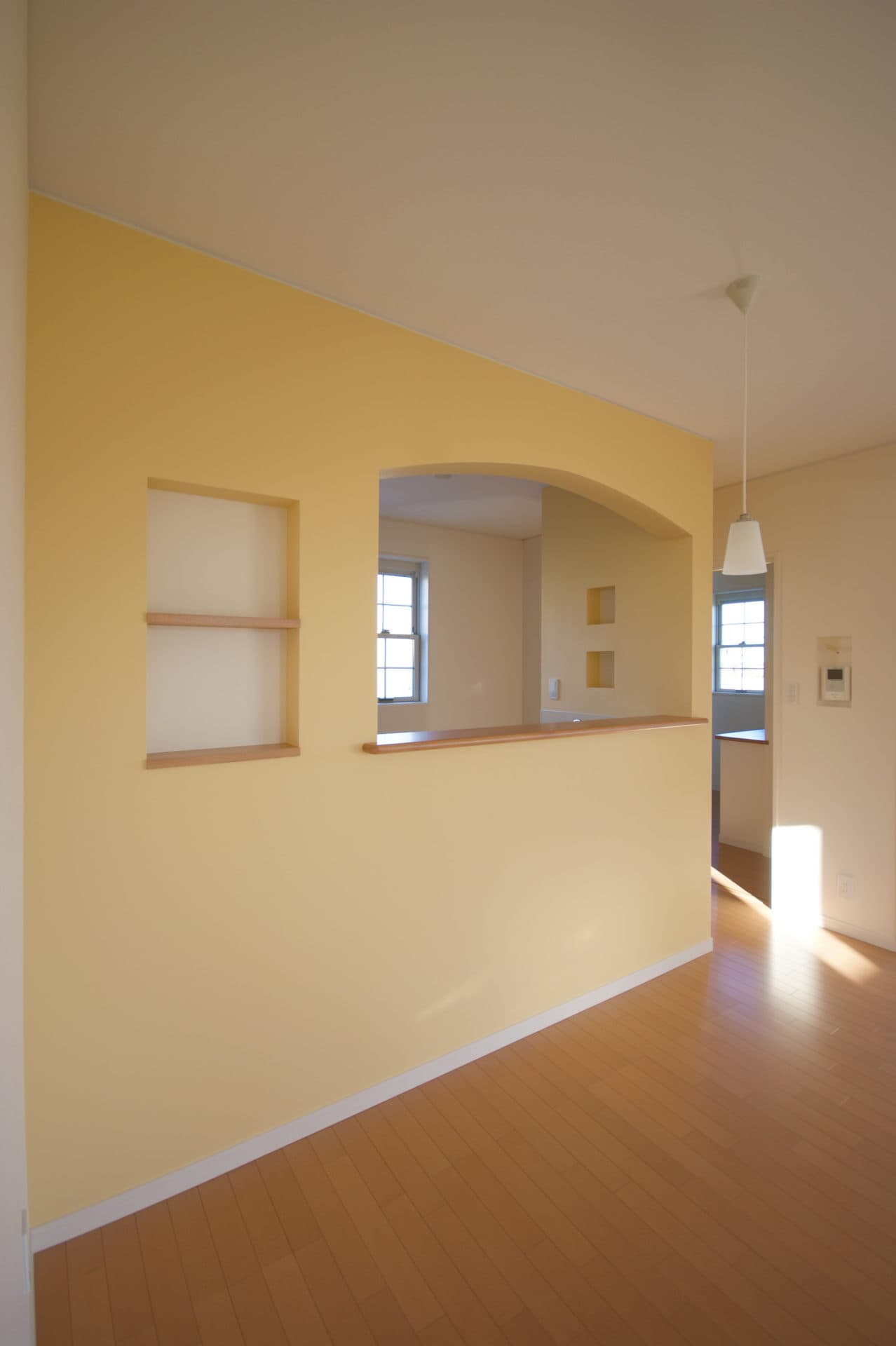 流しの前の壁がリビングとの対面オープン。ニッチとアーチ状でくりぬいていた空間が絶妙のバランス