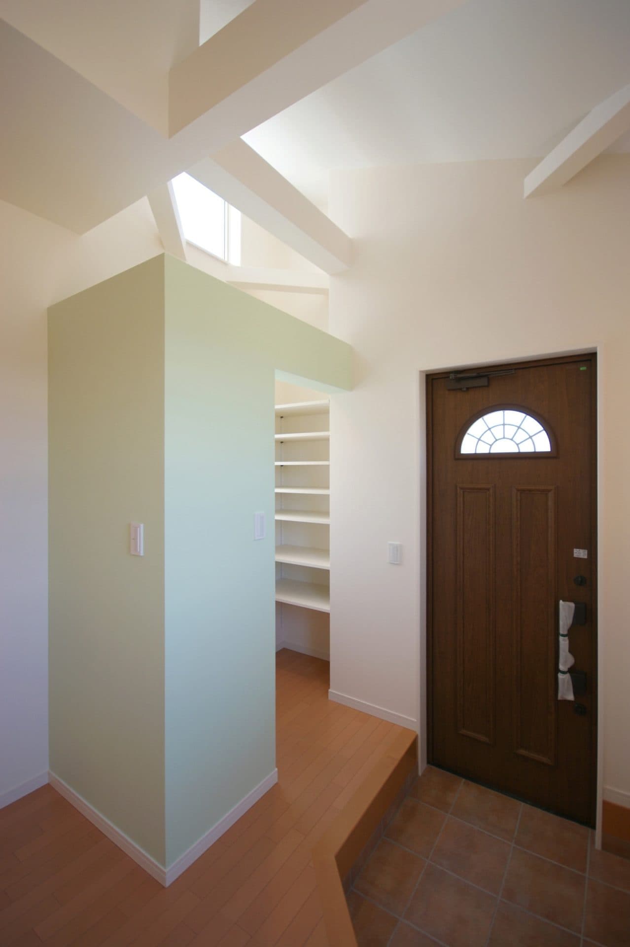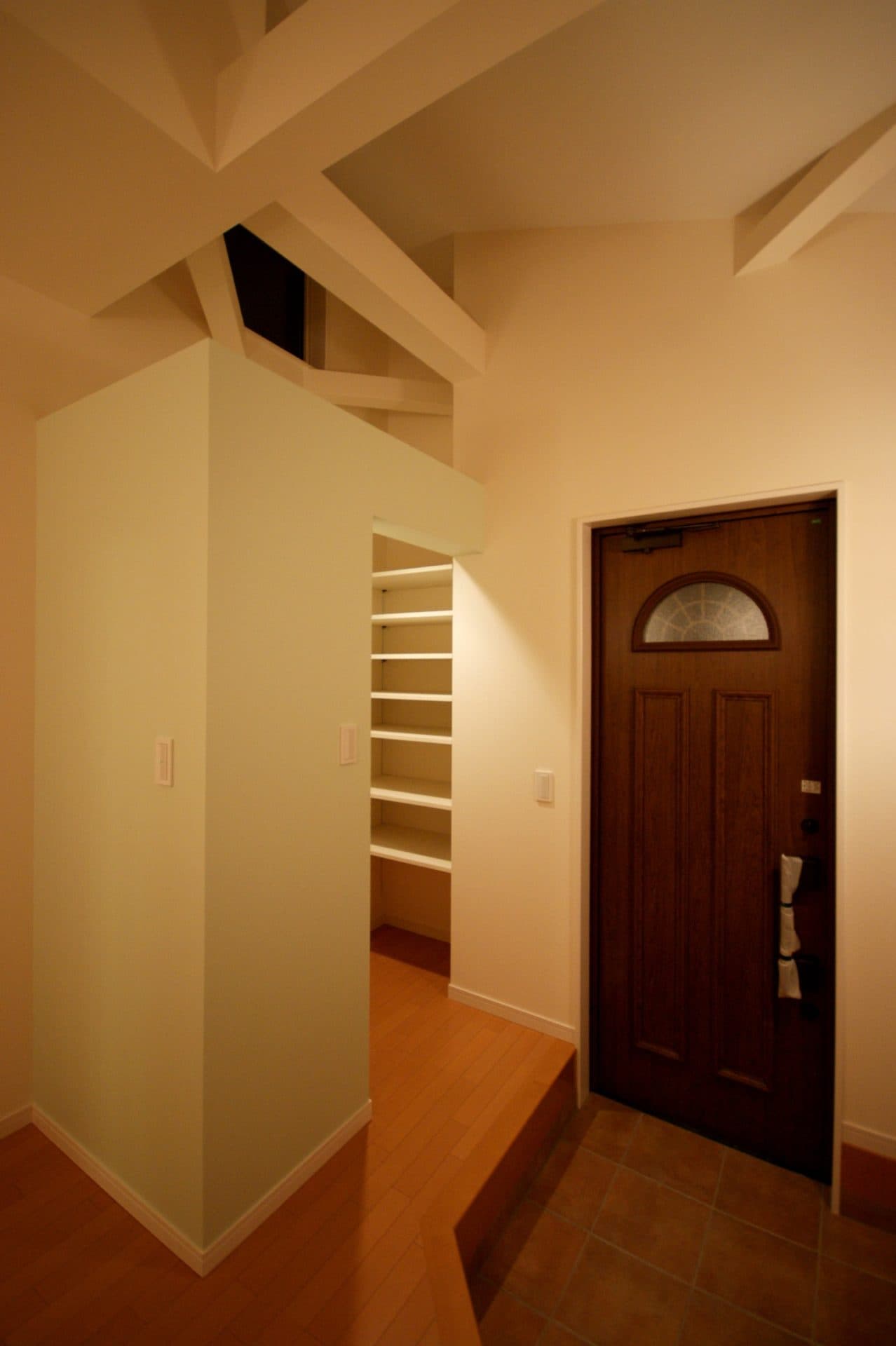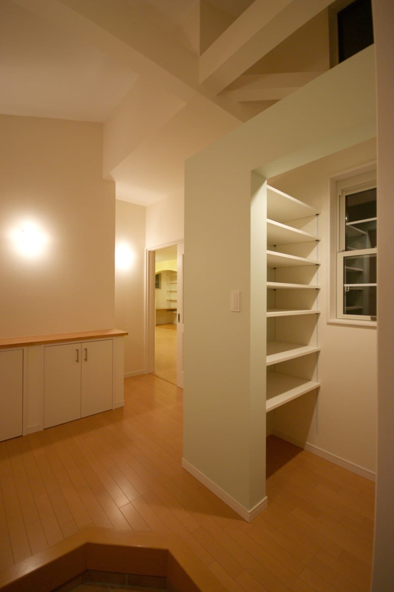 天井までたっぷりある シューズ収納部。 シューズクロークのアレンジ版。上げ下げ式の格子窓で換気もできます。