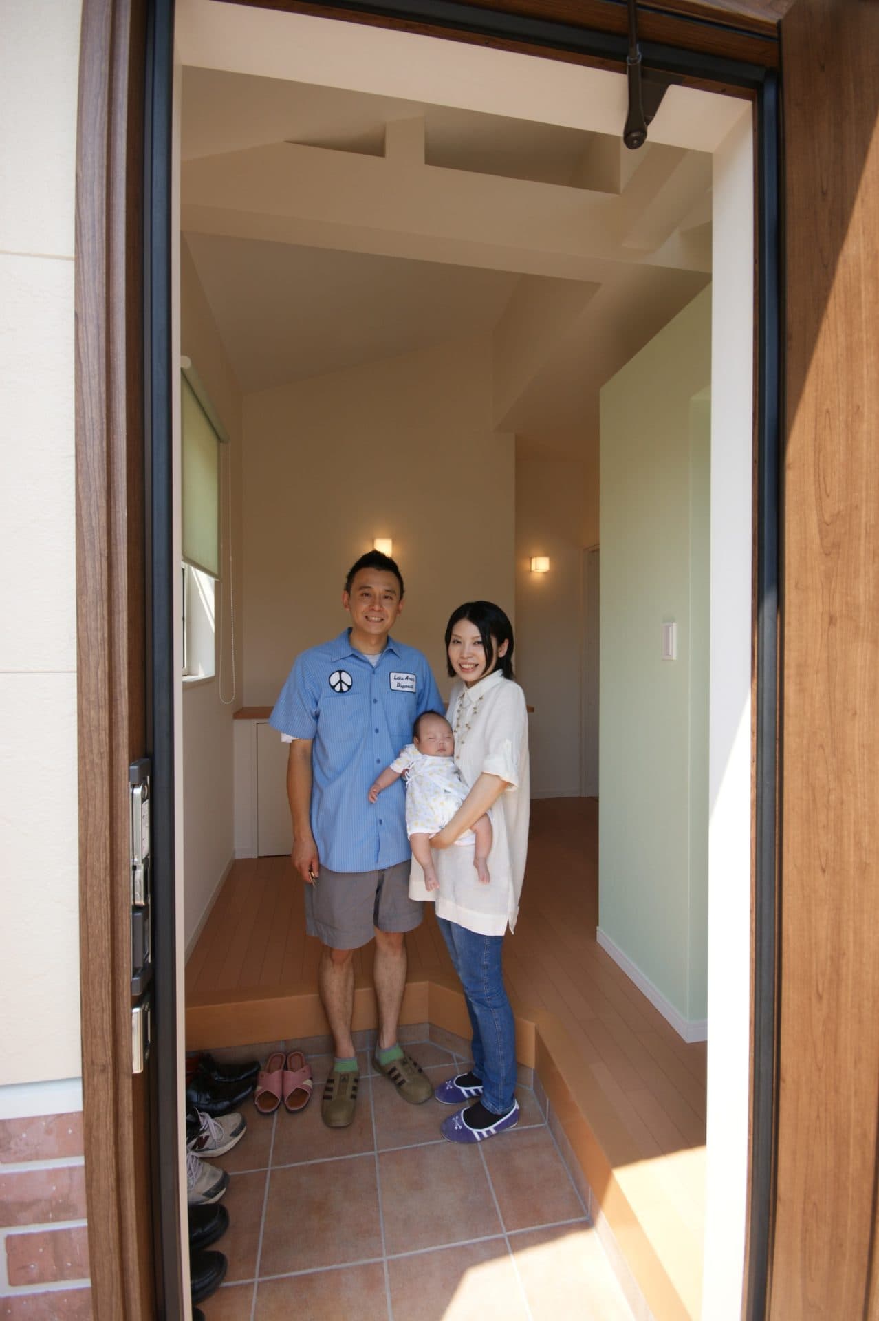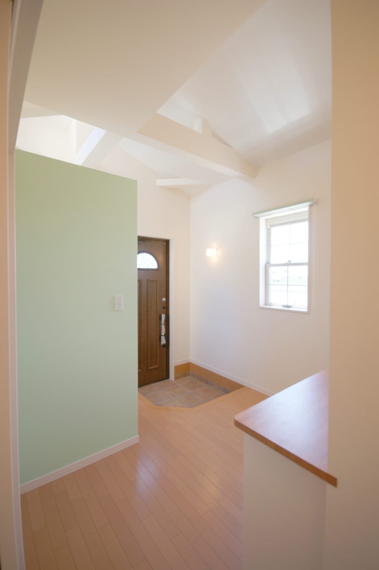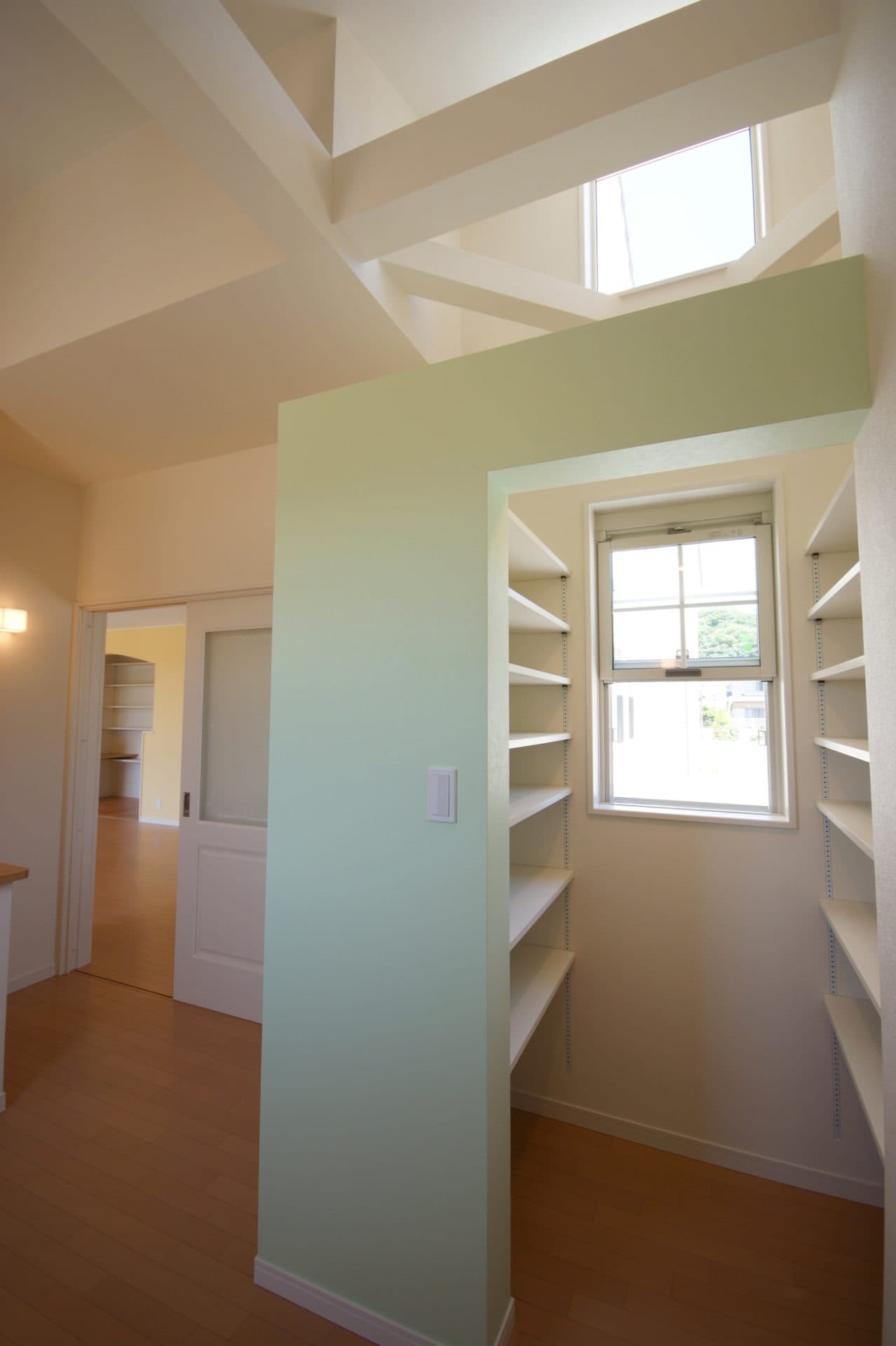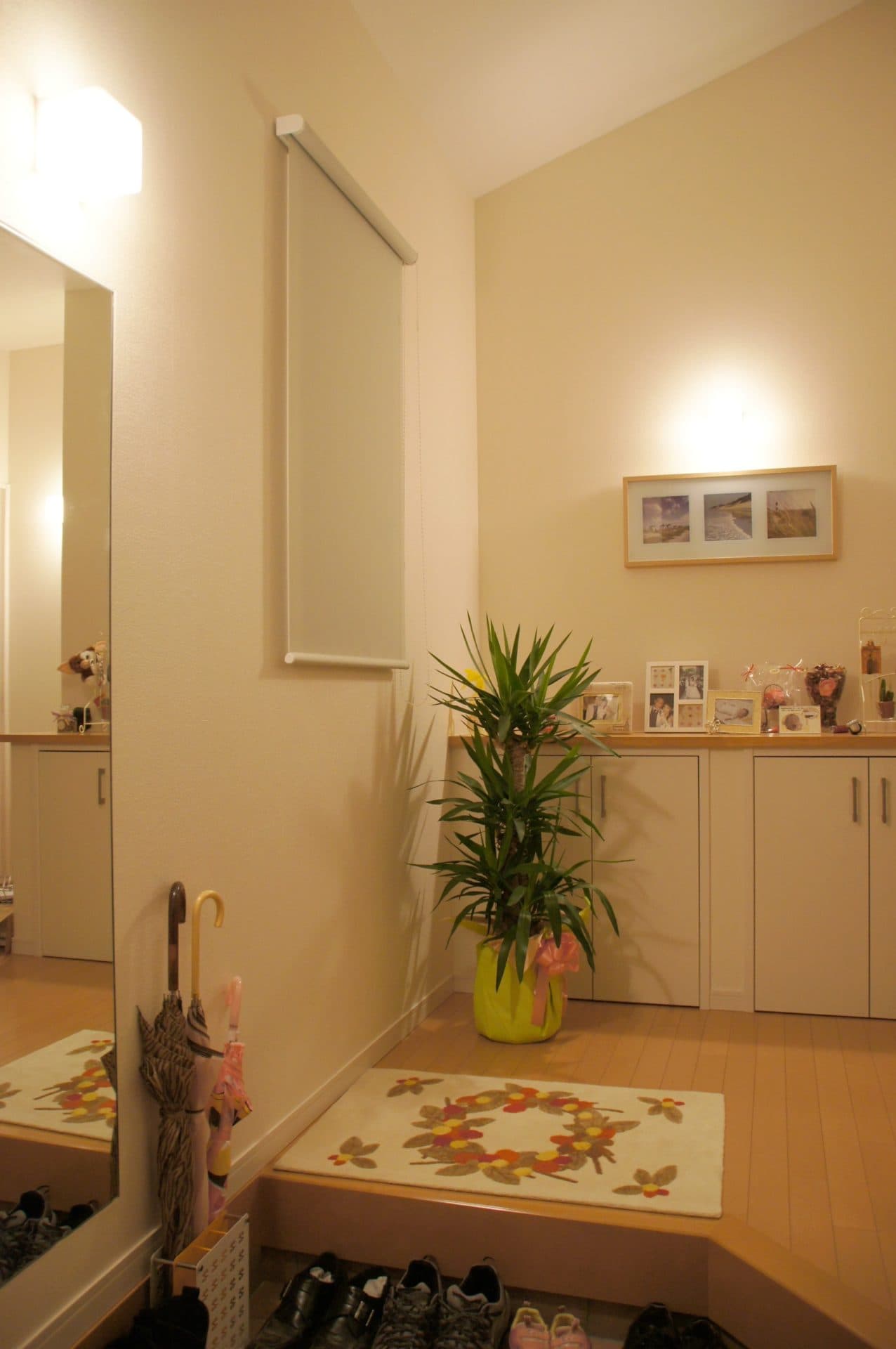 天井までたっぷりある シューズ収納部。 シューズクロークのアレンジ版。上げ下げ式の格子窓で換気もできます。