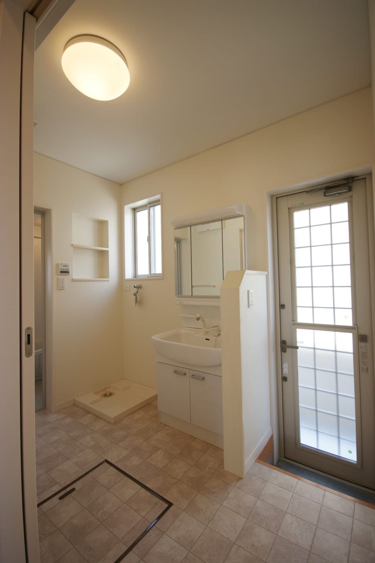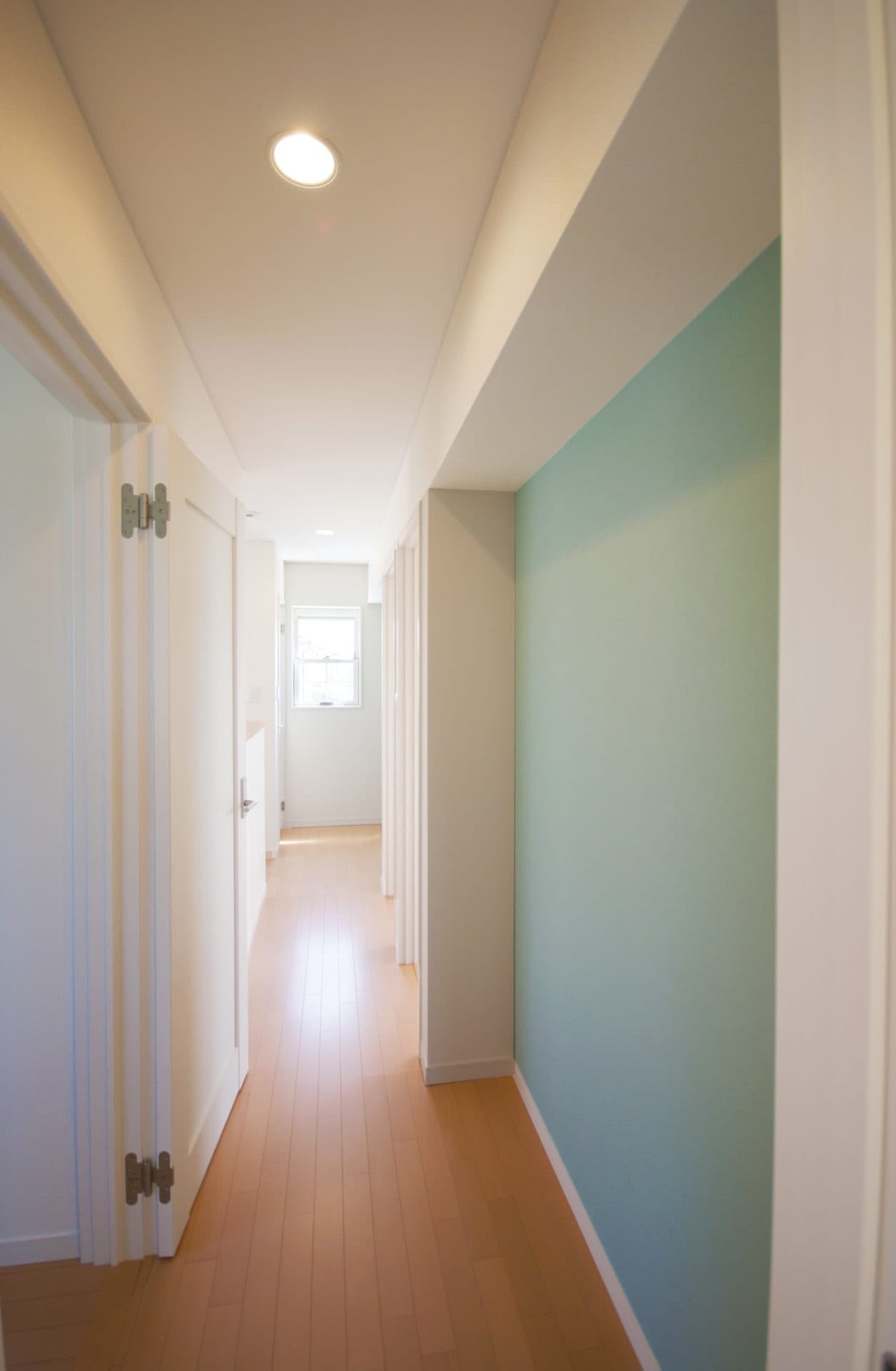 和室、玄関、キッチン、ウッドデッキ、洗面、お風呂全てがつながったパステルカラーのリビング。
